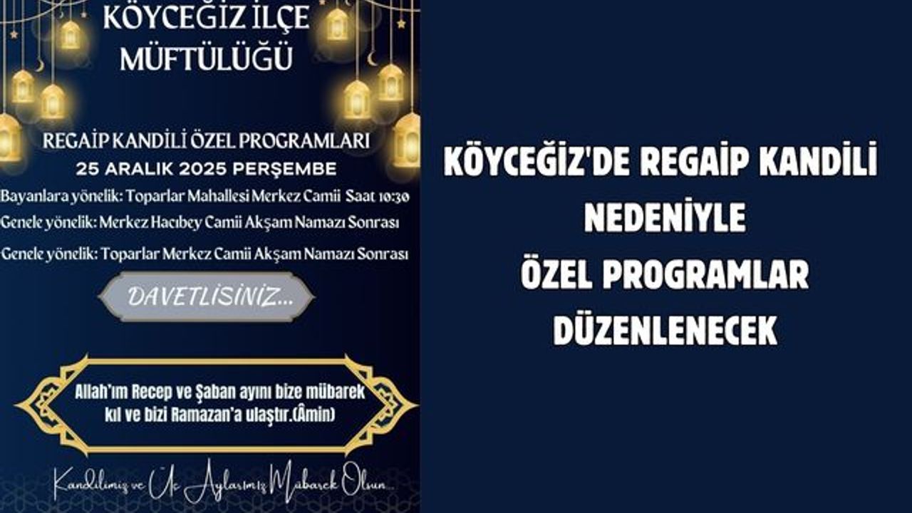 Köyceğiz Müftülüğü tarafından 25 Aralık 2025 Perşembe günü mübarek üç ayların ilk kandili olan Regaib Kandili nedeniyle özel programlar düzenlenecek. Regaib Kandili dolayısıyla Köyceğiz İlçe Müftülüğü tarafından perşembe günü saat 10.30’da Toparlar Mahallesi Merkez Camii’nde kadınlara yönelik kandil özel programı yapılacak. Akşam namazından sonra da tüm camilerde olduğu gibi Merkez Hacıbey Camii ve Toparlar Merkez Camii’nde kandil özel programı gerçekleştirilecek. Köyceğiz Müftülüğü düzenlenen özel programlara tüm halkı davet etti.